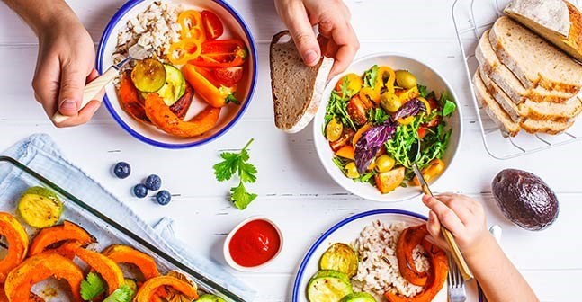 A good practice is to aim for a variety of colors on your plate. Fruits and vegetables like oranges, tomatoes, and dark, leafy greens—and even fresh herbs—are loaded with vitamins, fiber, and minerals.
