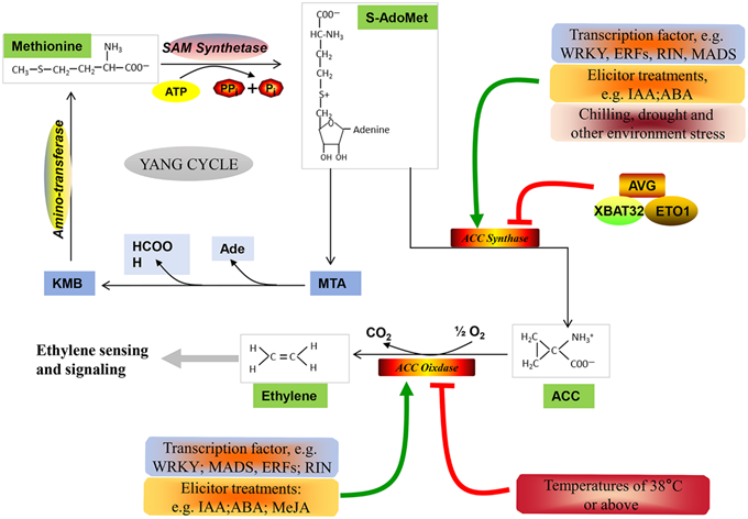 This process is regulated at multiple levels: auxin and abscisic acid (ABA) enhance ACS/ACO gene expression, whereas gibberellin generally inhibits it. Notably, ethylene exhibits autocatalytic regulation, leading to the characteristic ethylene burst in climacteric fruits such as tomato, apple, and banana.