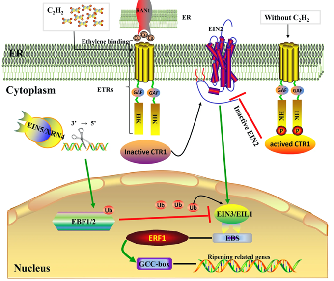 Ethylene is perceived by ETR/ERS receptors on the endoplasmic reticulum membrane and transduced via CTR1 to EIN2, which subsequently activates transcription factors EIN3/EIL and ERF. This signaling cascade regulates genes associated with ripening traits, including color change, softening, sugar accumulation, and aroma production.